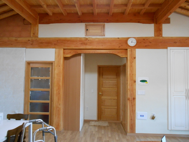 둘째, 전통한옥은 문과 창문틀을 구성하기 위해 기둥을 가로 질러 중방 하방이라는 부재에 문선을 수직으로 연결하여 문틀을 완성하지만 현대한옥은, 기둥과 분리된 별도의 문틀, 창문틀로 대체하여 공정이 간소화되었고 외부 구조도 간결해 졌습니다. 그에 따라 건축비도 다소 줄어 들게 되었습니다.